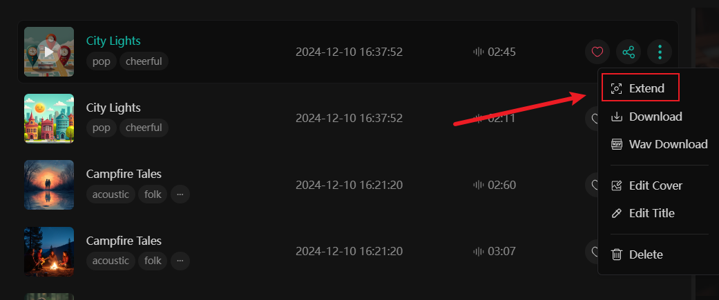 The 'Extend' feature is ideal if you'd like to add more to your song. Whether you want to extend an instrumental section or add a new verse, this tool makes it easy to expand your song without starting from scratch. If you need further assistance, visit our Frequently Asked Questions page for additional tips and support.