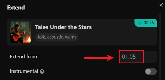 Lyric Mode: If you want to continue the song with lyrics, disable Instrumental Mode. Then, enter the Lyrics and Style of Music to extend the previous verses and keep the song going.