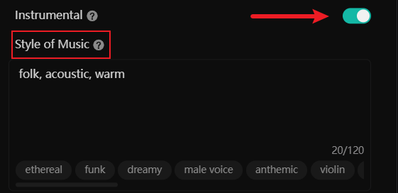 Learn more here:How to Write Style Prompt and Lyrics in Custom Mode