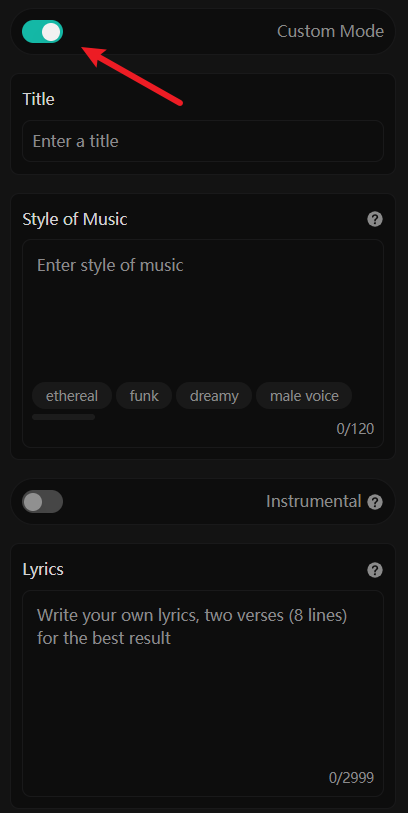 Ideal for those who want full creative control. 1. Toggle Custom Mode on. 2. Enter your own Lyrics. 3. Describe the Style of Music you’re aiming for. 4. Give your song a catchy Title. Learn more here:How to Write Style Prompt and Lyrics in Custom Mode