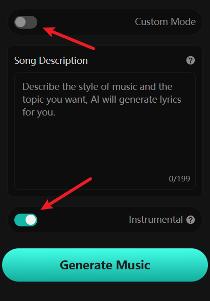 Perfect for when you want to create a song quickly and easily. 1. Ensure Custom Mode is toggled off. 2. Enter a description in the Song Description field to tell the AI what you’d like. 3. If you want an instrumental track without lyrics, simply toggle the "Instrumental" option on. Learn more here:How to Write Song Description in Simple Mode